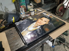 Затем из металлического профиля мы изготавливаем рамку, тыльную сторону которой закрывает прямоугольный белый фон. Распечатанный на плёнке портрет мы приклеиваем к вспененной основе для придания необходимого объёма и жесткости.